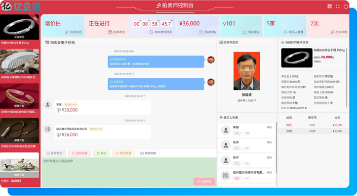 拍賣師可在拍賣控制臺(tái)主持競(jìng)拍,拍賣師發(fā)言、暫停/開(kāi)始、出價(jià)回滾、流拍、撤拍等!