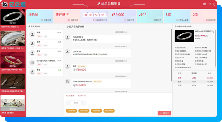 線上客戶可通過(guò)競(jìng)拍系統(tǒng)出價(jià),現(xiàn)場(chǎng)客戶可由記錄員代為出價(jià)。對(duì)于全是現(xiàn)場(chǎng)客戶的情況,億企拍也可作為競(jìng)拍全流程電子檔案。